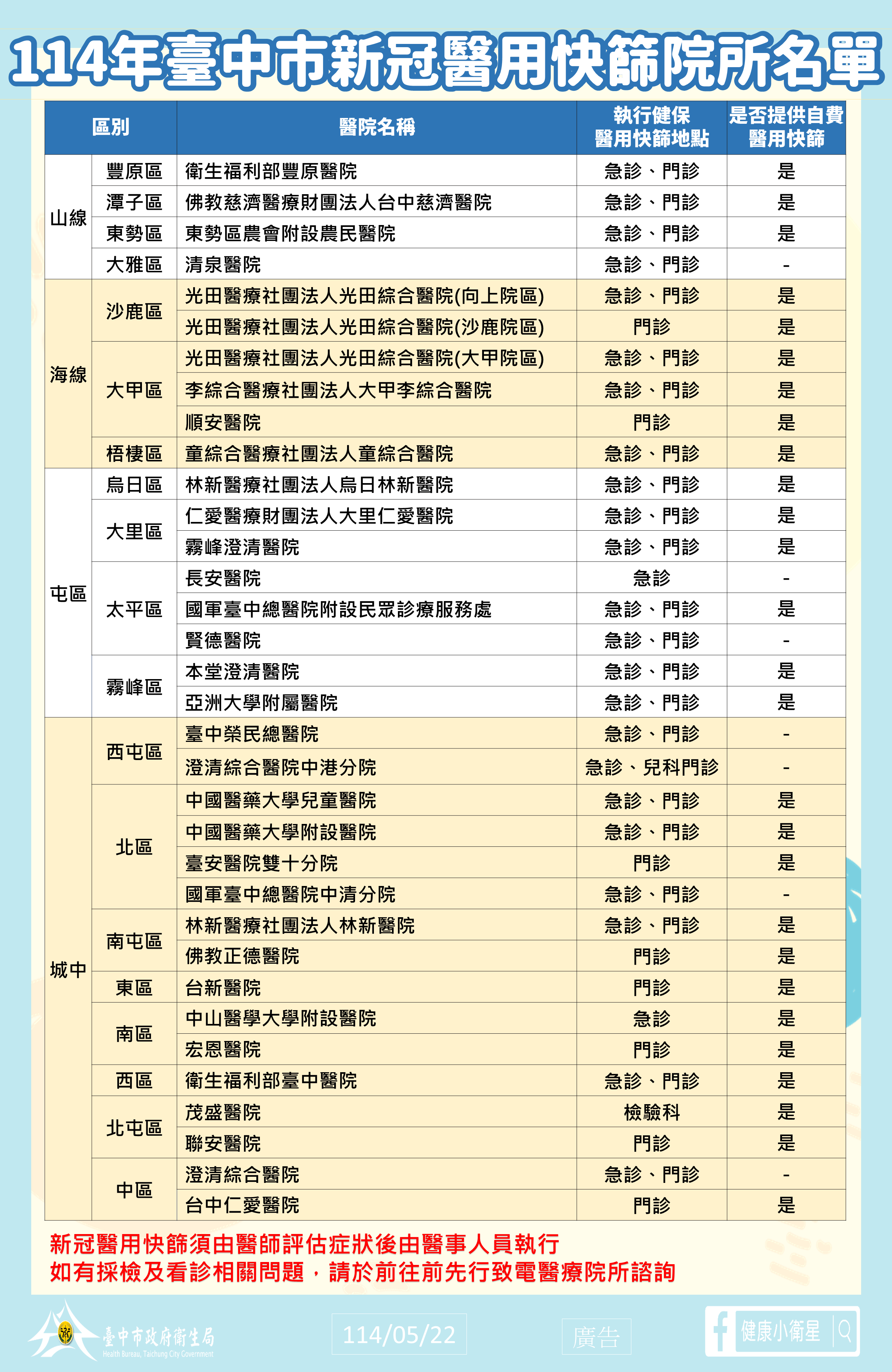 臺中市COVID-19醫用快篩提供院所名單及家用快篩販售藥局