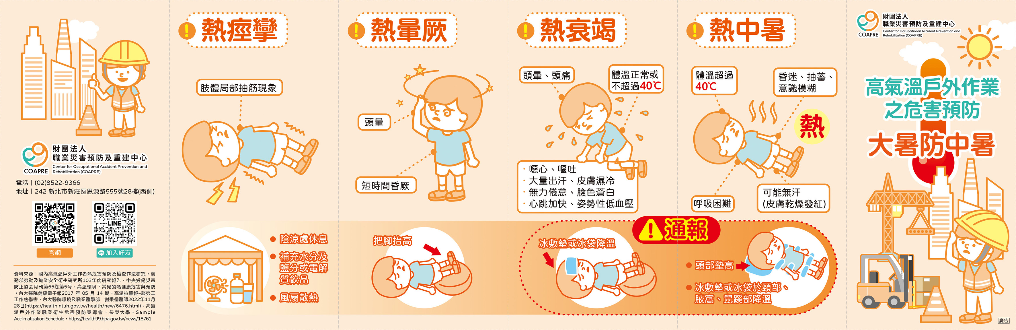 勞動部職業安全衛生署 高氣溫作業危害預防專區-勞動部職業安全衛生署,提供「高氣溫作業危害介紹(含常見熱疾病種類及成因)」、「相關法令-職業安全衛生設施規則第324之6條及高氣溫戶外作業勞工熱危害預防指引」、「宣導資料」及「高氣溫戶外作業熱危害預防行動資訊網」;