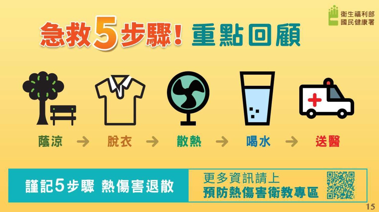 2.注意身心狀況:戶外活動者、運動員等,應隨時留意自己及身邊友人的身體狀況,如體溫升高、皮膚乾熱變紅、心跳加速,請儘快休息並補充水分。