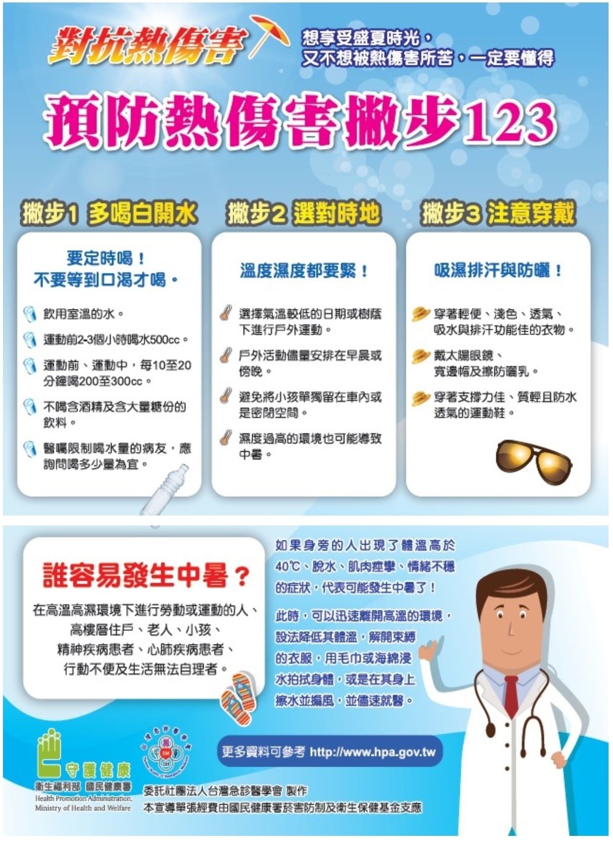 - 該部考量近年受氣候變遷影響全球氣溫偏高,若無適當防護措施任何人都有可能發生熱傷害,爰提供旨揭預防熱傷害衛教宣導素材,以強化高溫熱傷害整備防救能力及易受傷害族群之多元關懷措施與管道。